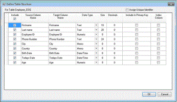 - To modify the various criteria for target table columns, click the Primary Key or Indexed Column field for the desired view. The Defined Table Structure panel appears. Modify the necessary data (for example, Target Column Name, Data Type, Size, Decimal, Primary Key, Indexes, Incremental Values, etc.), then click OK.